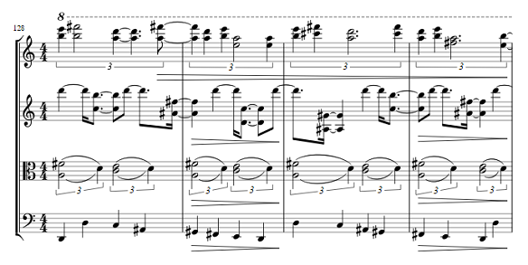 Soon the other two instruments enter, each with its own distinct rhythmic profile. The viola plays steady quarter-note triplets, while the first violin is in freer rhythm playing a soaring melody with mostly long notes (it’s this melody that approximates the role of a “first theme” in classical sonata form). Left alone, the three lower instruments’ note cycles would converge every 2½ bars, but at measure 27 the second violin starts to hiccup, while the cello drops out to quote Ives’ First Violin Sonata.